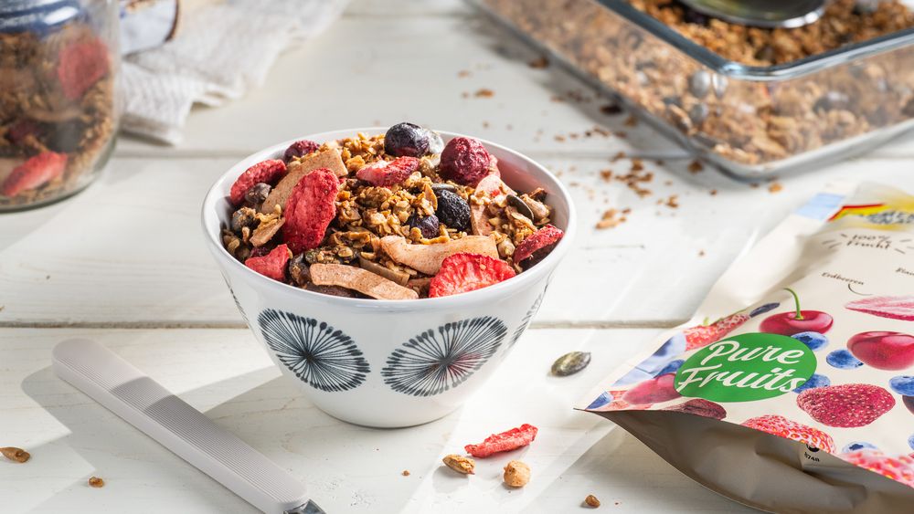 „Unsere gefriergetrockneten Früchte in Scheiben sind einfach herrlich knusprig und eignen sich ideal in Bowls, als Topping für Müsli oder pur als Snack. Dabei überzeugen unsere Pure Fruits neben ihrem besonders intensiven Geschmack vor allem mit ihren ernährungsphysiologischen Vorteilen, da sie besonders vitamin- und nährstoffschonend getrocknet sind."