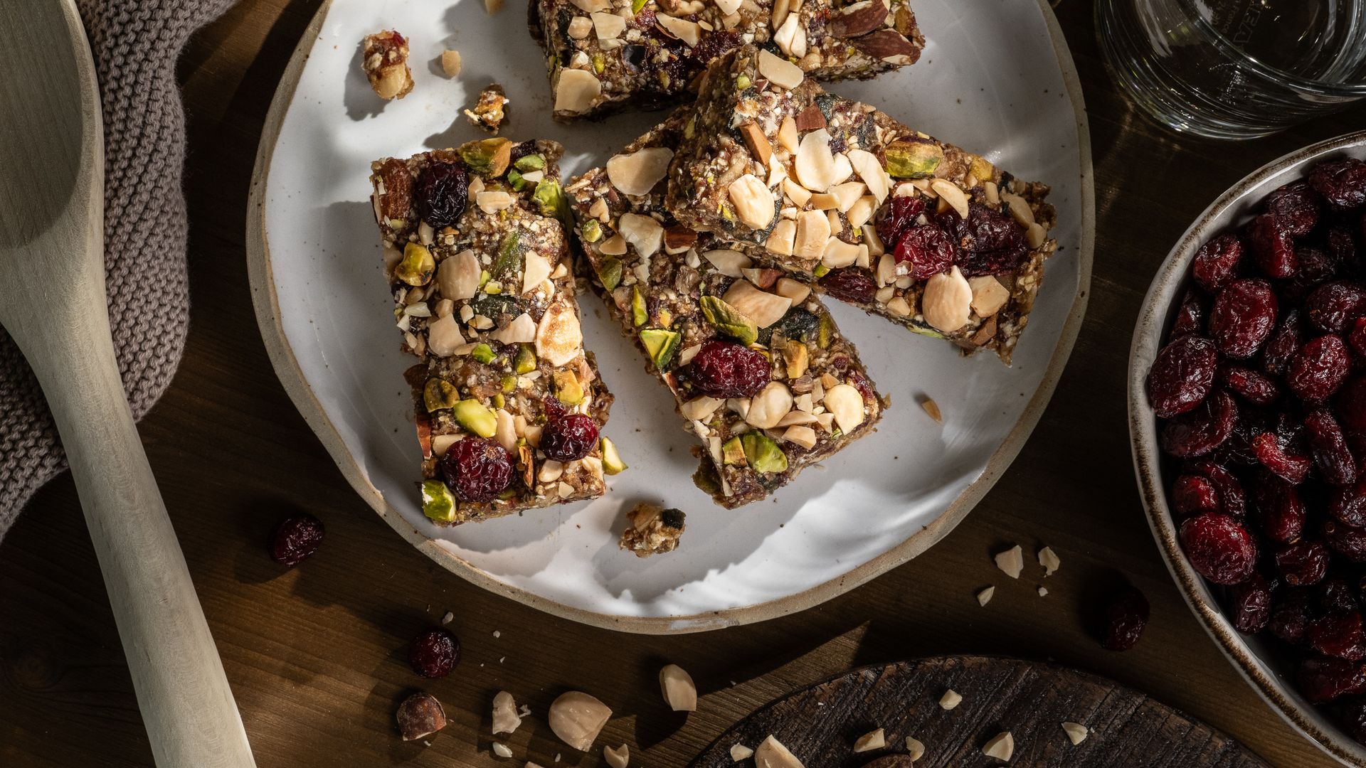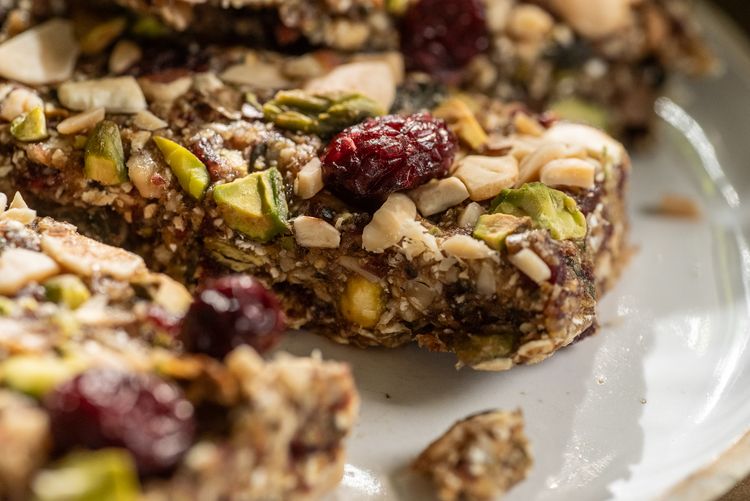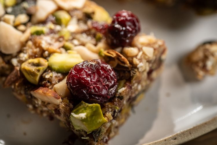 - In eine quadratische Form geben, fest andrücken. Unbedingt noch mit gehackten Nüssen und Cranberries toppen!